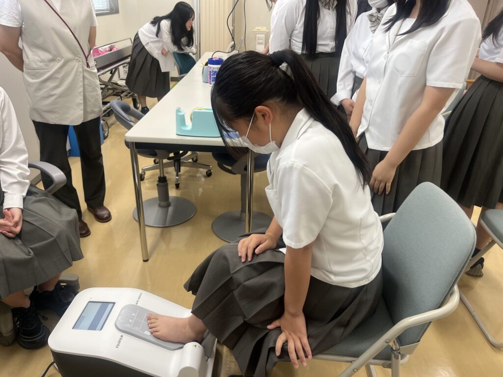 ランチタイムには、教員と交流を図ったり、研究所の測定機器で自身の骨密度や経皮的にヘモグロビン推定値を測定する機器で貧血の状態を測定したり体験を行いました。