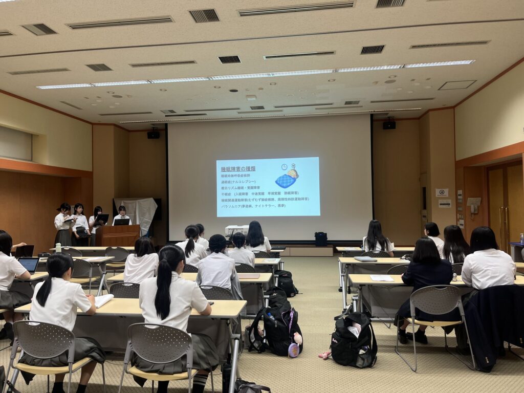 午後は、自分たちの決めた健康に関するテーマについてグループで事前に調査した内容をについて発表を行い、生徒同士や研究所教員と意見交換を行いました。