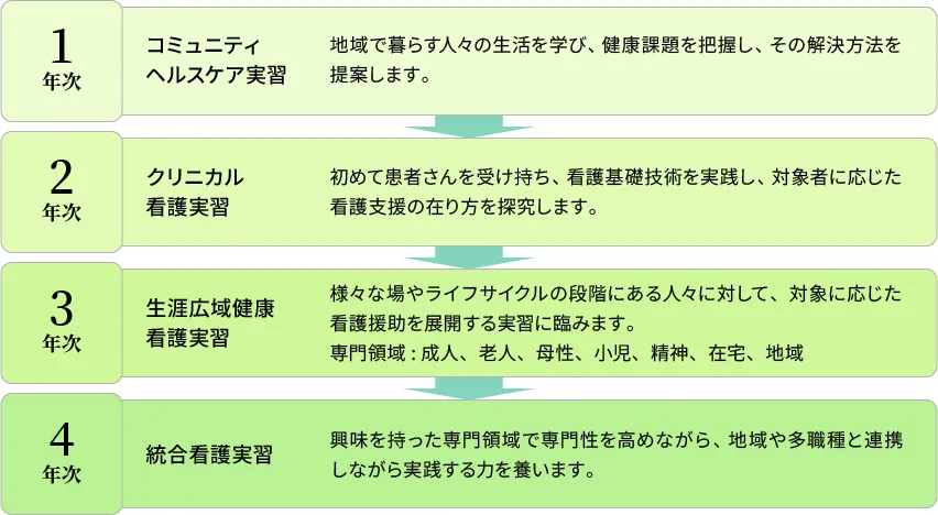 看護職として疾病や健康障害を有する人々をケアするための基礎的な知識や、実践力をつけていきます。講義形式の授業以外に、実践に近い環境の中でケア技術を学習する演習や人の生活に焦点をあてた実習カリキュラムが、1年生から4年生まで組まれています。