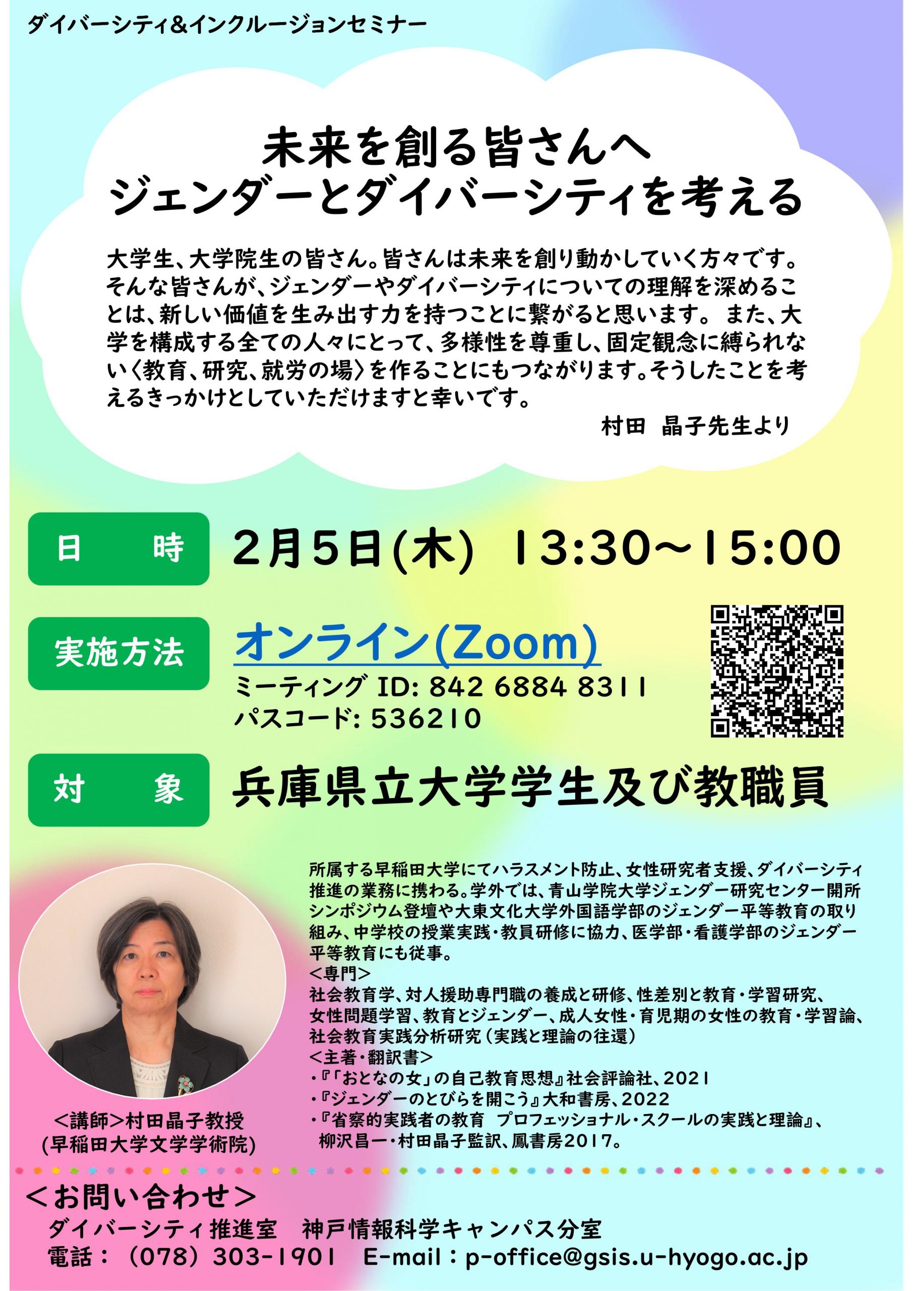神戸情報科学キャンパスでは、様々な立場の教職員や学生が、グローバル化が急速に進む社会における異文化の違いや多様性について考えこれからどうするのか、これからより良くするにはどうすればよいかと自分事として取り組んで行く意識啓発になる事を目的に、早稲田大学大学院教授の村田晶子先生をお迎えし、講演『未来を創る皆さんへ―ジェンダーとダイバーシティを考える―』が開催されました。