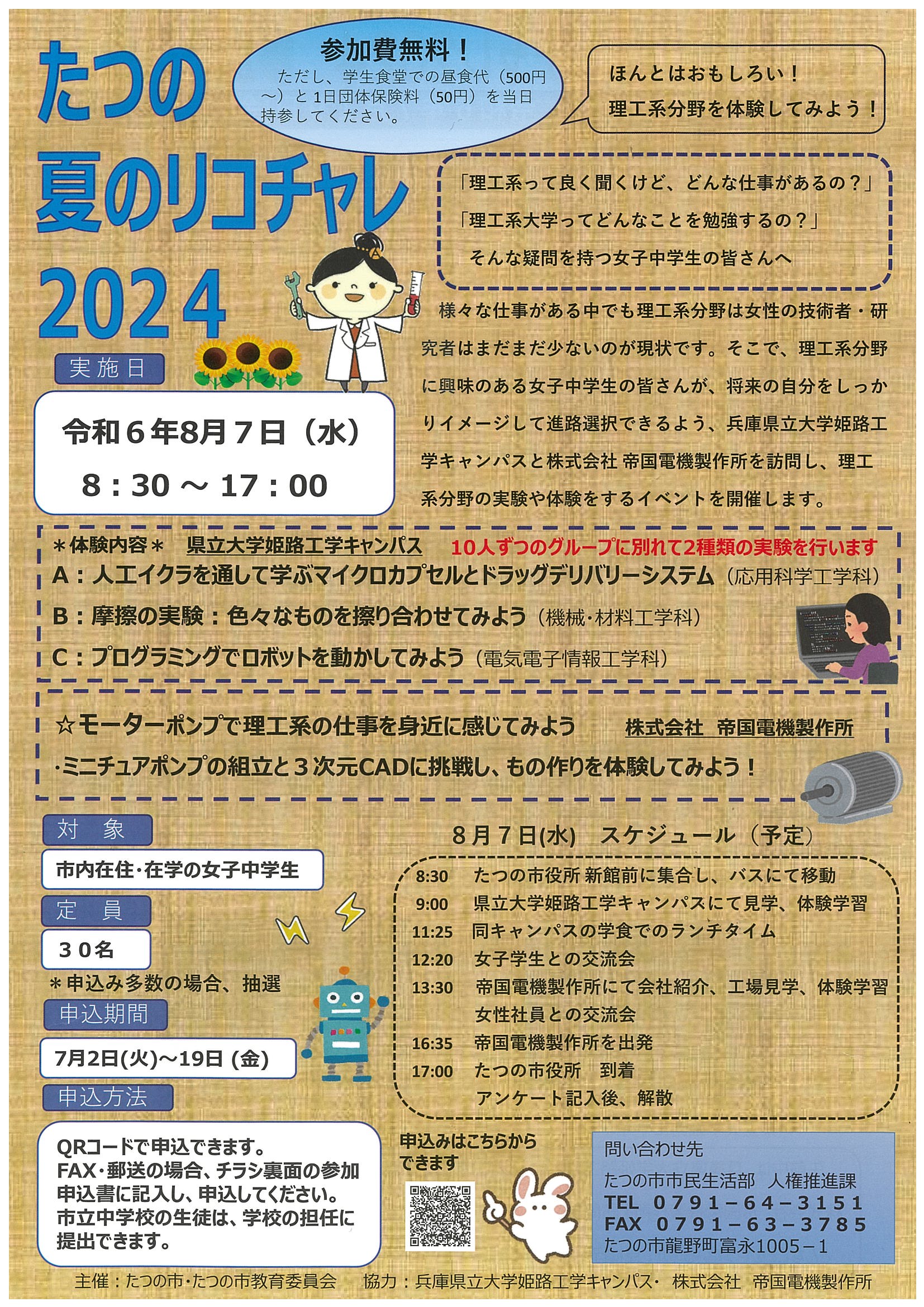 理工系分野に興味を持つ たつの市内在住・在学の女子中学生が、市内の大学や企業への訪問と見学、体験学習等を通じて、将来の自分をしっかりイメージして進路選択できるよう企画された「たつの夏のリコチャレ2024」が実施されました。