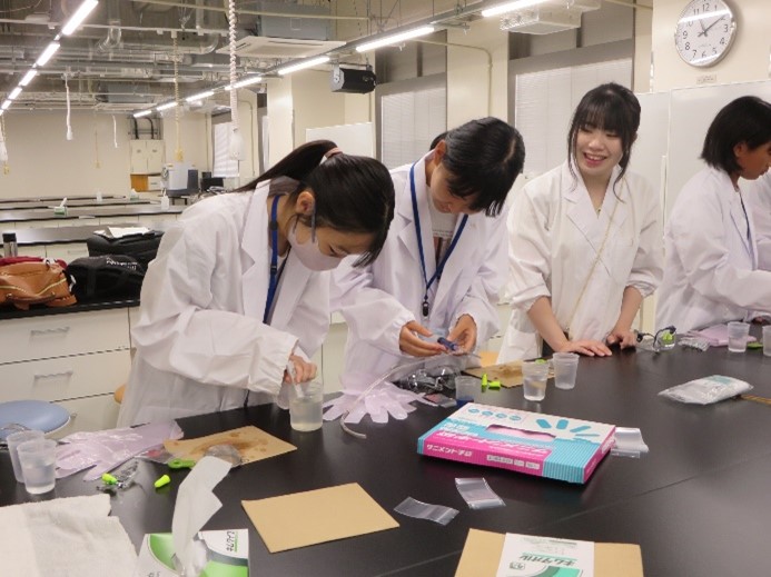 バスで到着した女性中学生は3つのグループにわかれ、下記の実験のうち、それぞれ希望する2種類の実験を体験しました。
