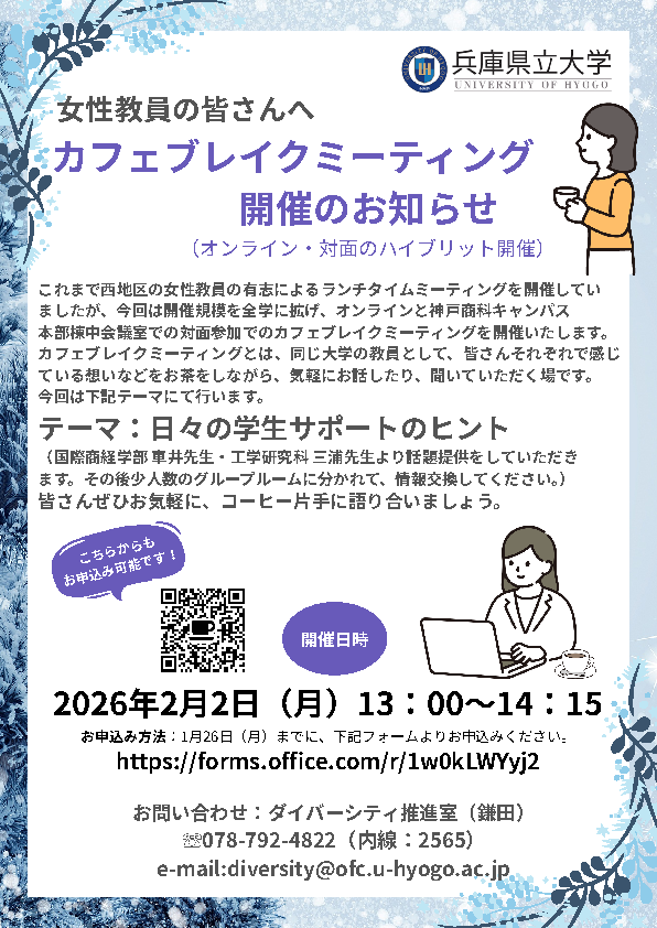 これまで西地区の女性教員の有志によるランチタイムミーティングを開催していましたが、今回は初めて開催規模を全学に拡大し、オンラインと神戸商科キャンパス本部棟会議室での対面参加でのカフェブレイクミーティングを開催いたしました。