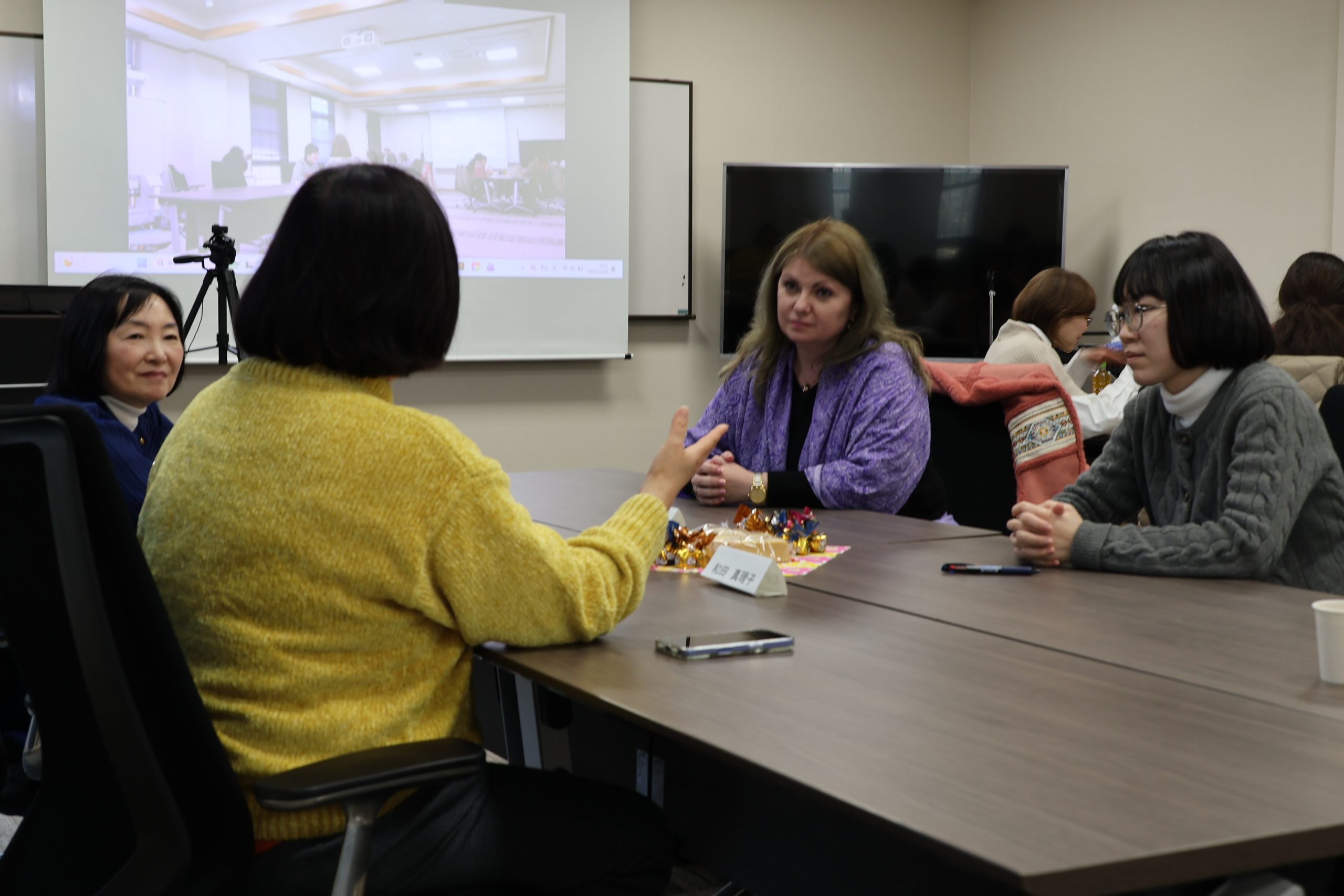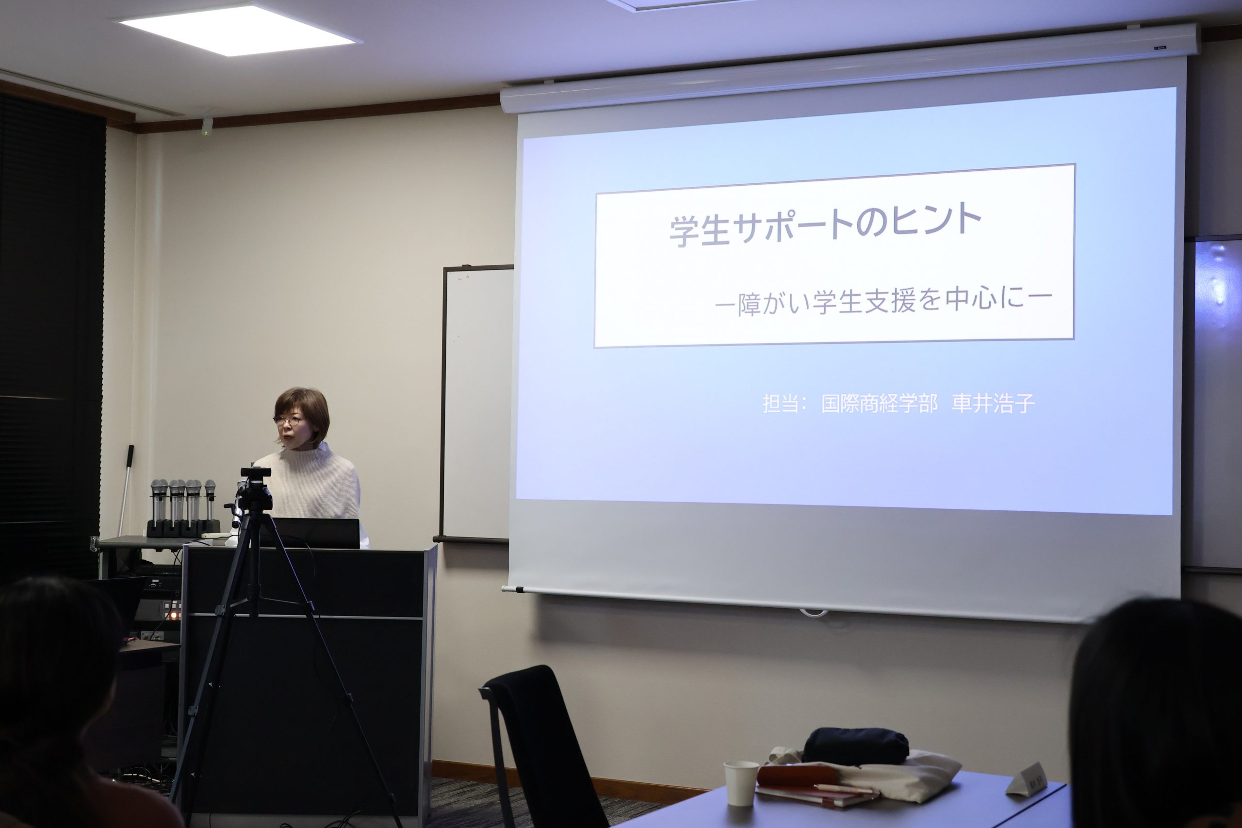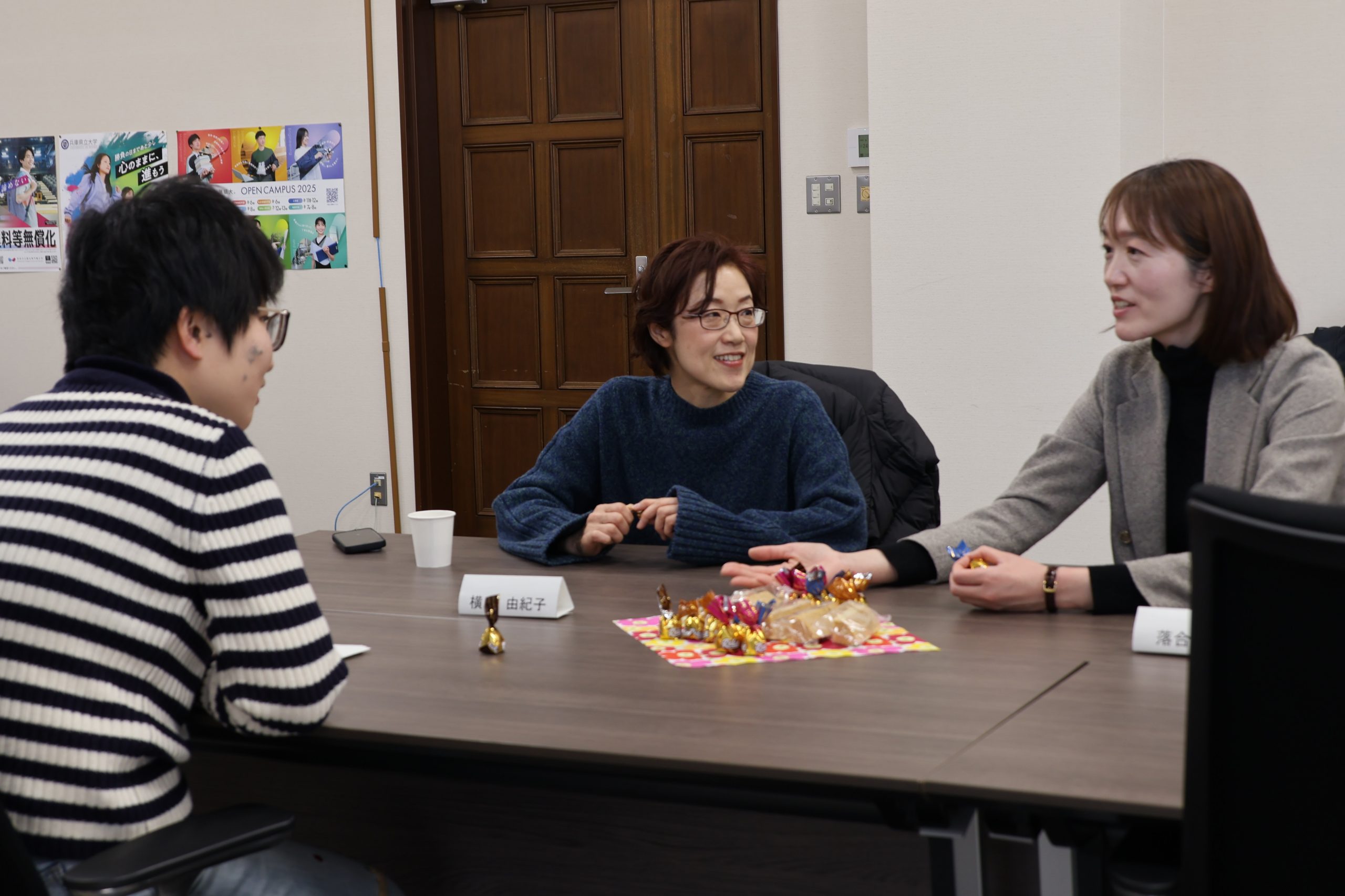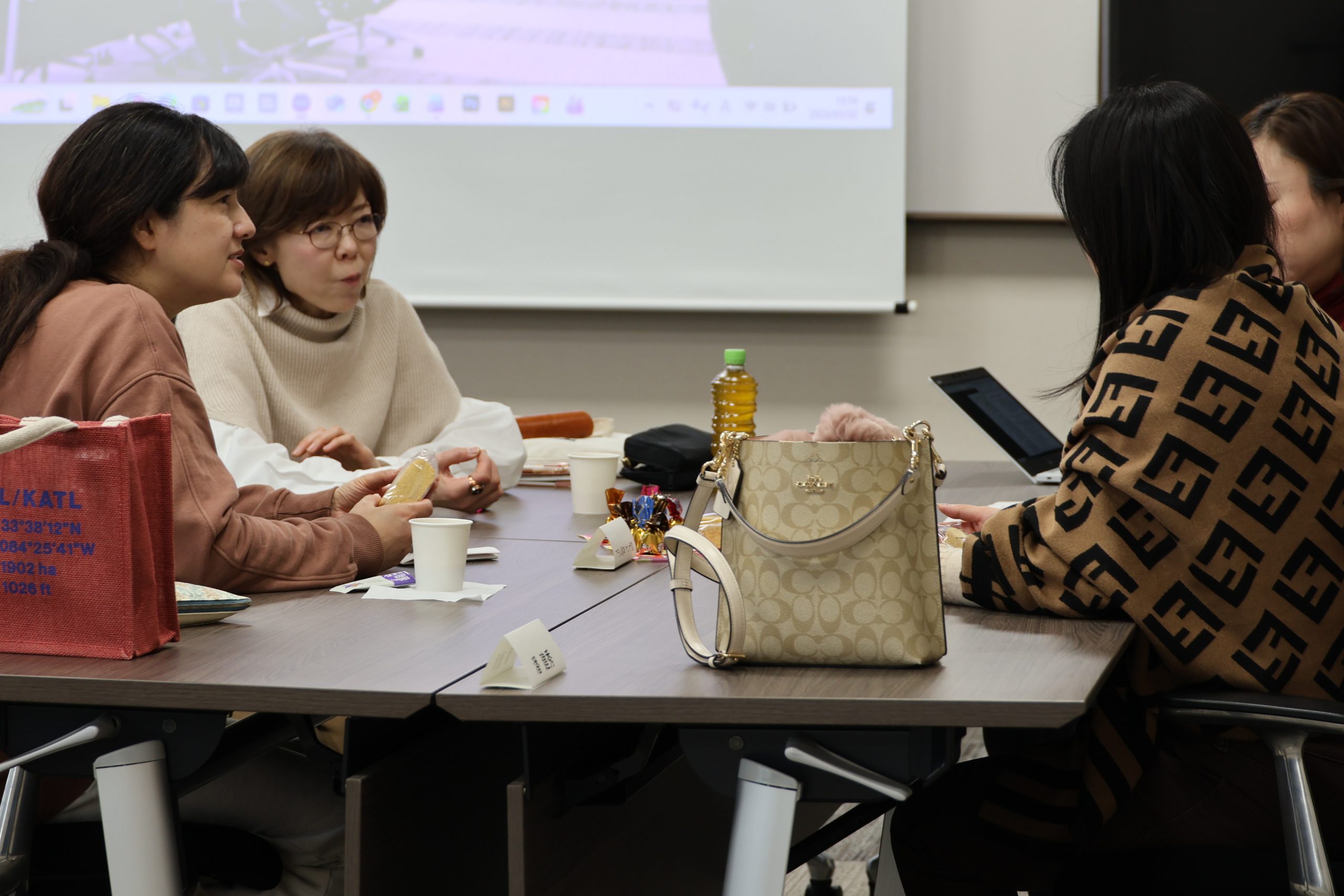 ダイバーシティ推進室坂下室長の挨拶のあと、国際商経学部車井先生と工学研究科三浦先生より日々の学生サポートのヒントをテーマに話題提供をしていただきました。そのあとはオンライン参加者はブレイクアウトルームに分かれ、対面参加者はテーブル毎に3名から4名のグループに分かれ約25分間情報交換や交流を行いました。お茶やお菓子を楽しみながら、和やかな雰囲気で交流を深めました。
