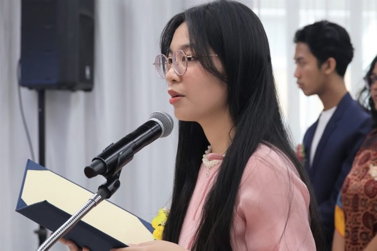 During the matriculation address by the representative of new GBC students, Ms. Le Thu Minh from Vietnam delivered an address. She stated: