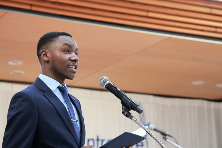 In the welcome address by the representative of current GBC students, Mr. Niyibizi Gad from Rwanda shared his experience, stating: