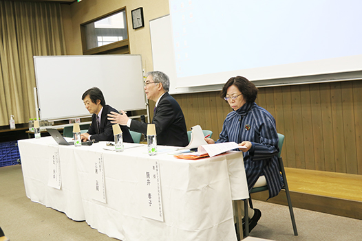 本学の三浦公嗣特任教授が「診療報酬の同時改訂が示唆すること」、「一体的取組の科学的評価」等について、基調講演を行いました。続いて杉山客員教授が「栄養摂取の意義」、「栄養ケアマネジメントの改善」について、筒井教授が「多職種協働」等について講演しました。