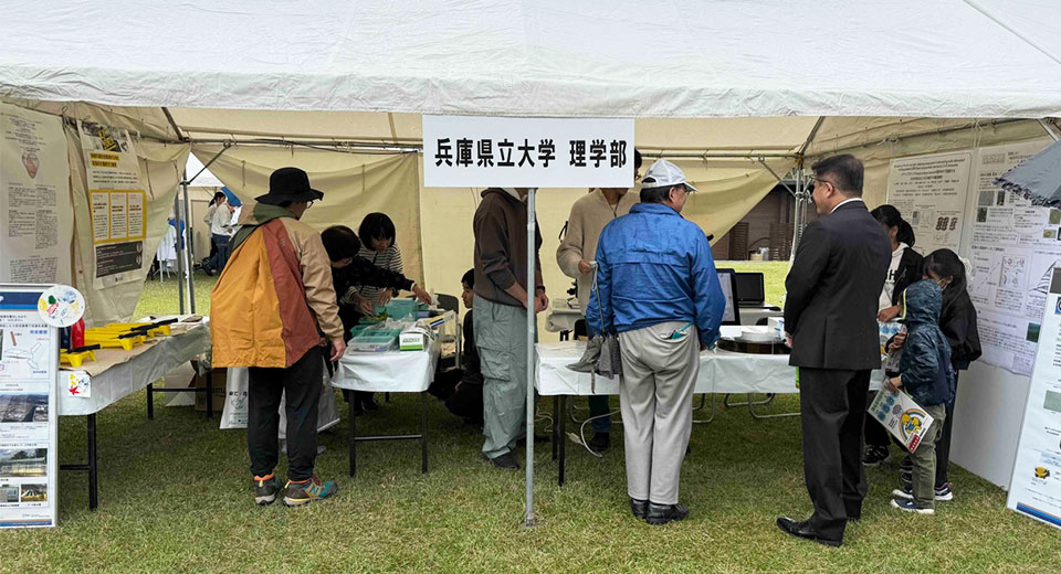 「西播磨地域の連携・交流の促進と播磨科学公園都市の賑わい創出及び新たなスポーツ体験の提供やひょうごフィールドパビリオンの認知度向上、阪神・淡路大震災からの「創造的復興」理念の共有・継承を図ることを目的として「ここから未来 元気・西播磨」を合言葉に」 (https://web.pref.hyogo.lg.jp/whk02/frontier2025.html)『西播磨フロンティア祭2025』が、2025年10月25日(土)に開催されました。例年のように、理学研究科から科学教室を出展しました。今年度は、微細藻類の一種、珪藻の光合成機能を利用して、将来的なバイオ燃料生産を目指した応用研究や、二枚貝の餌料生産のための珪藻の大量培養技術等について、クイズを交えた展示・解説を行いました。また、来場者に、藻類を含む微生物の顕微鏡観察を楽しんでいただきました。さらに、ちびっ子には光合成生物に親しんでもらうため、各種植物の葉っぱの版画を用意し、きれいな版画を作って楽しんでもらいました。