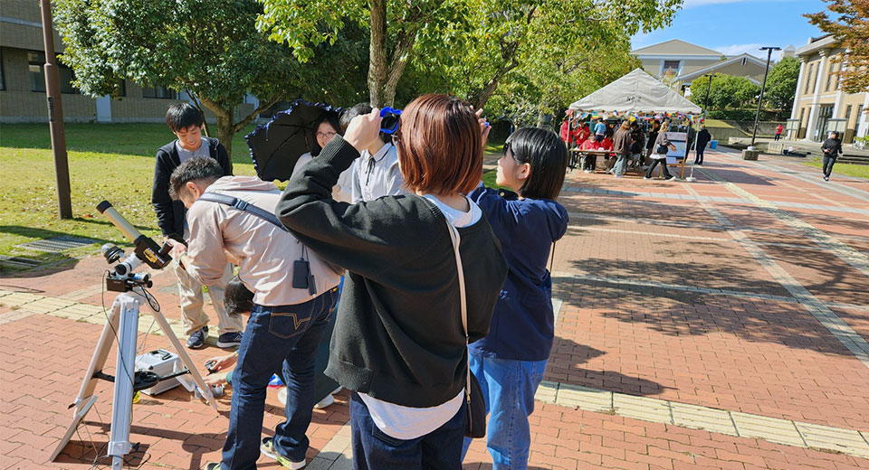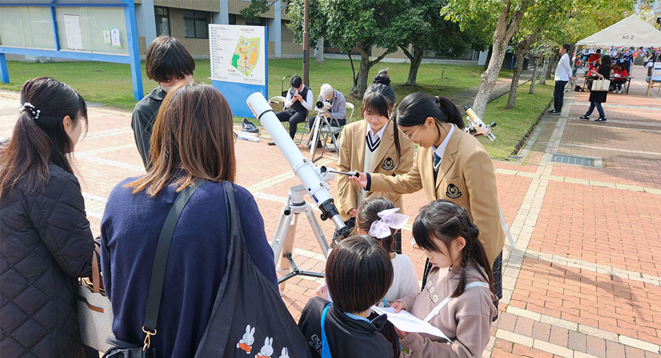 商大祭2025(10/31~11/2)のなかで、自然・環境科学研究所SDGs推進室のイベントとして、太陽観察会を開催しました。 11月1日(土曜日)は、神戸高専自然科学部天文班、 11月2日(日曜日)は、舞子高校天文気象部とのコラボで行いました。 目で直接太陽を見てはいけませんが、両日共にHα望遠鏡と呼ばれる特殊な望遠鏡で観察しました。 2日目は曇りで観察が難しかったのですが、初日は黒点もプロミネンスも観察できました。 特にお子様づれのご家族が喜んで観察してくれました。