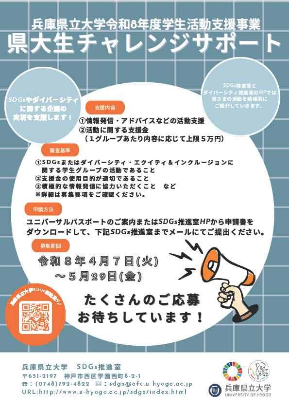 今年度もSDGs推進やダイバーシティ推進に関連する活動を支援する県大生チャレンジサポートを実施します。 みなさまのたくさんのご応募、お待ちしています! 詳細は募集要項をご覧ください。