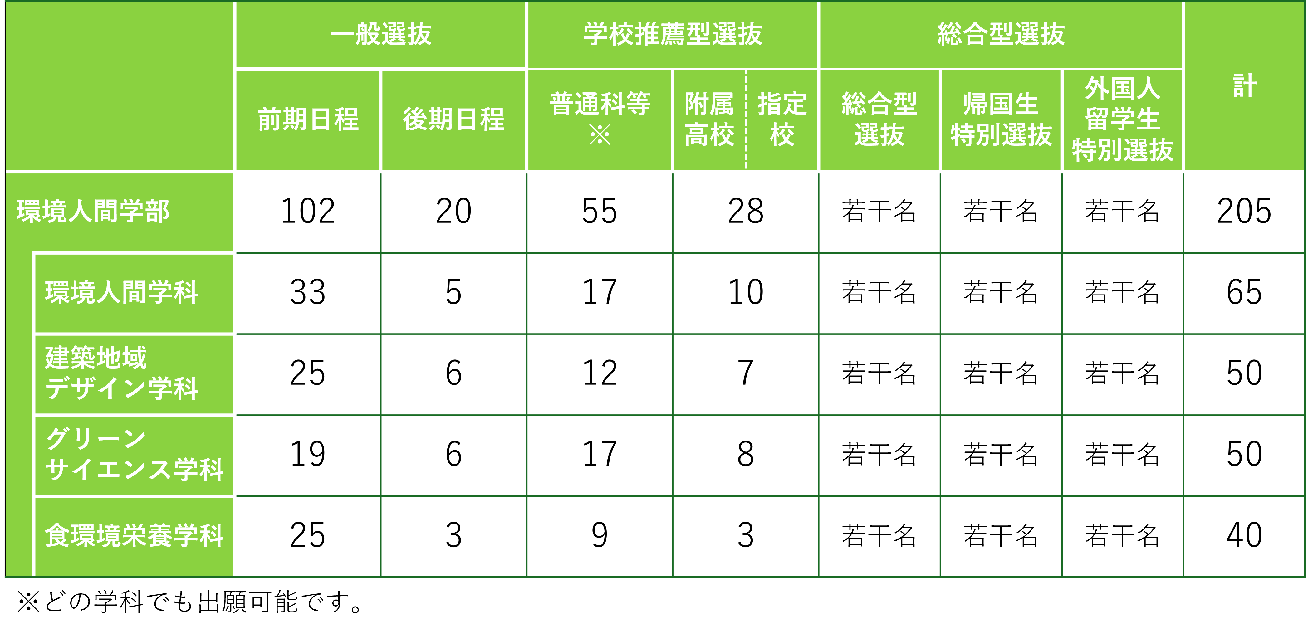 環境人間学部では多様な個性を受け入れたいという思いから、多様な選抜方法を設けています。それぞれによって試験内容が異なりますので、「入学者選抜の変更等について(第1報)」及び「入学者選抜の変更等について(第2報)」をご覧ください。